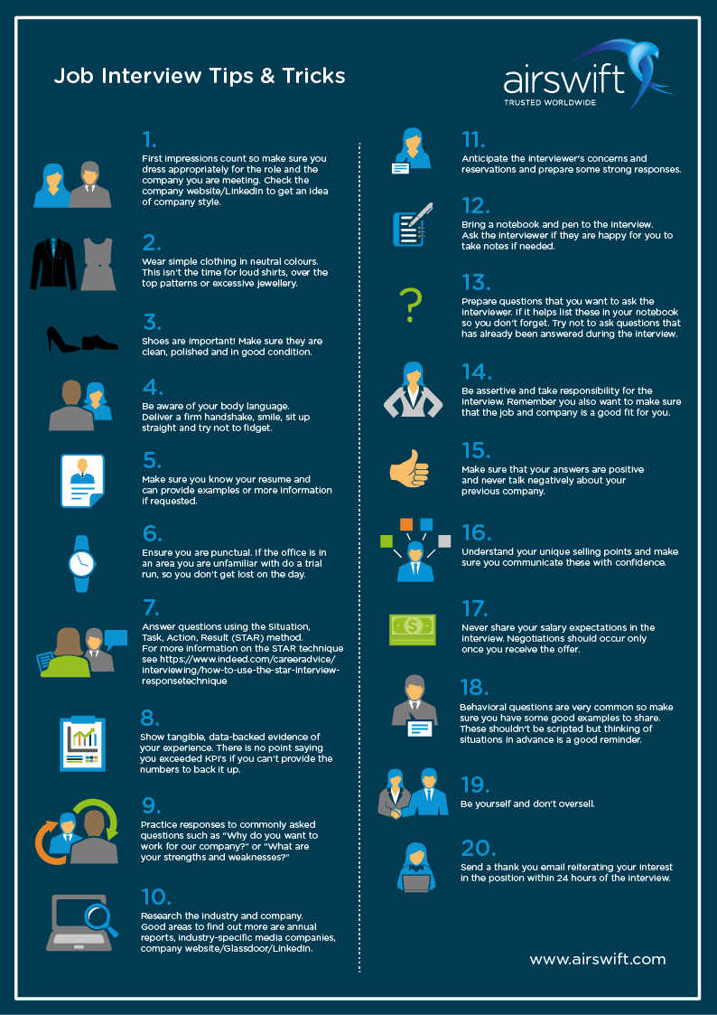 To help, here is a list of 20 job interview tips and tricks.